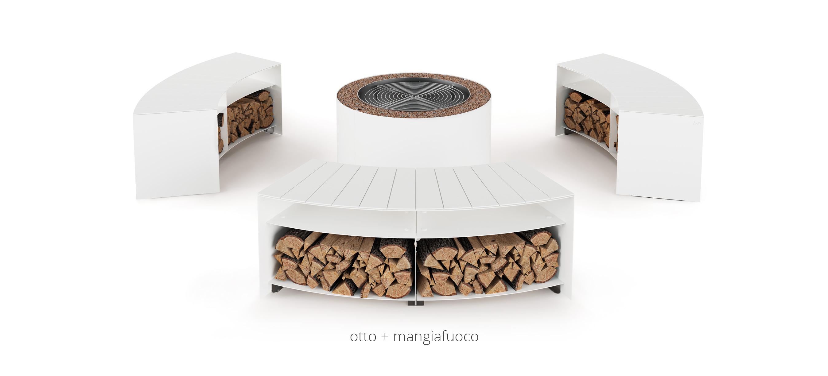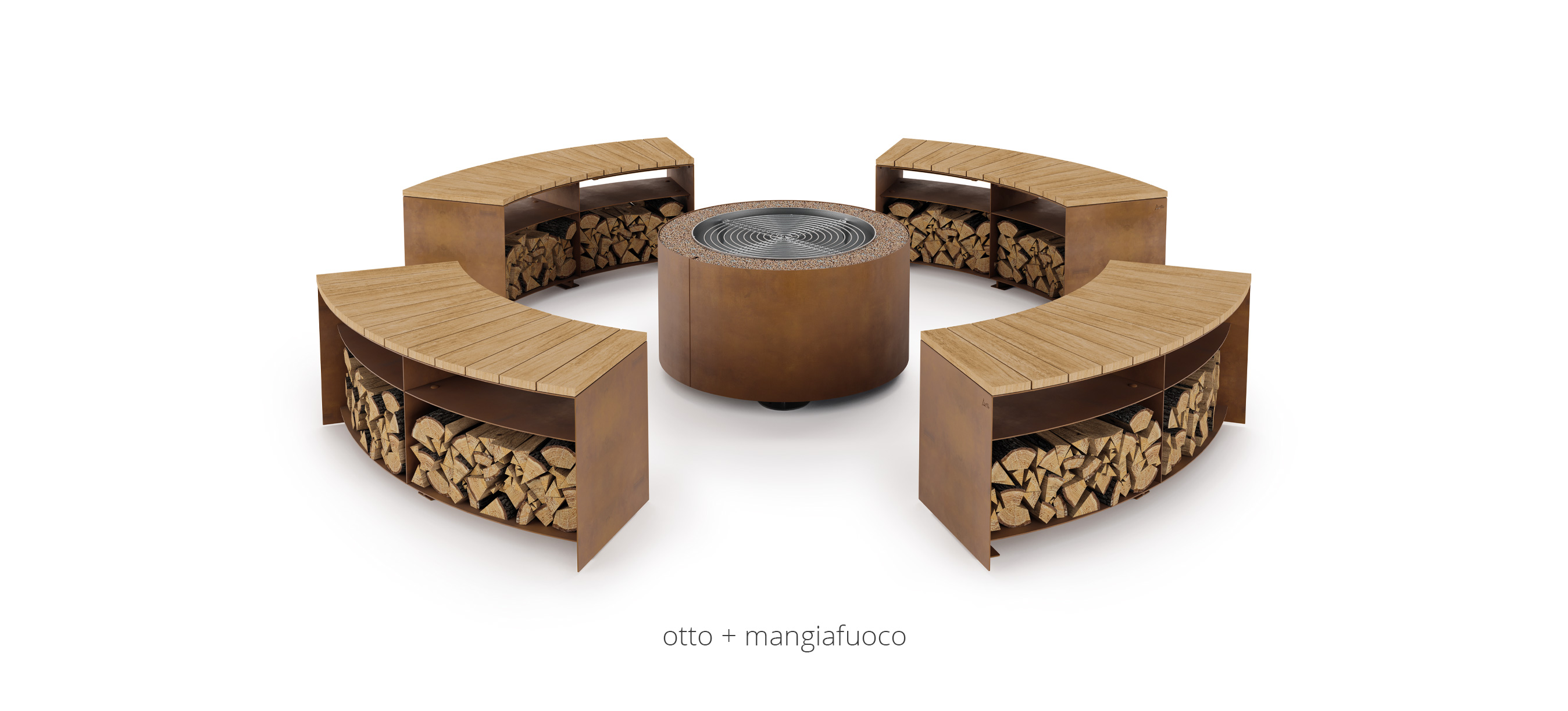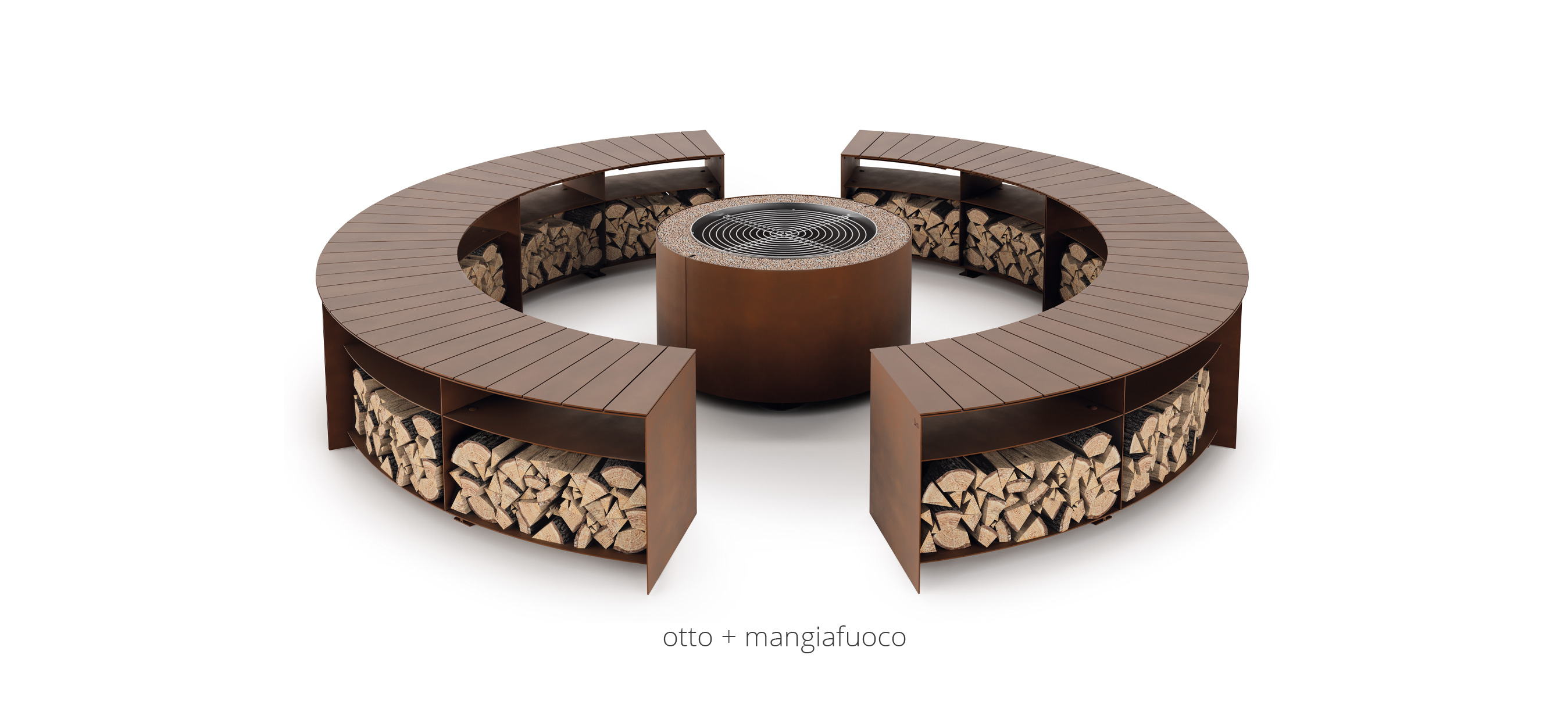 Una seduta per esterno, un nido dove rifugiarsi, lasciarsi riscaldare dal fuoco: all'eccentrica danza delle fiamme si sostituisce il silenzioso ardere della brace.