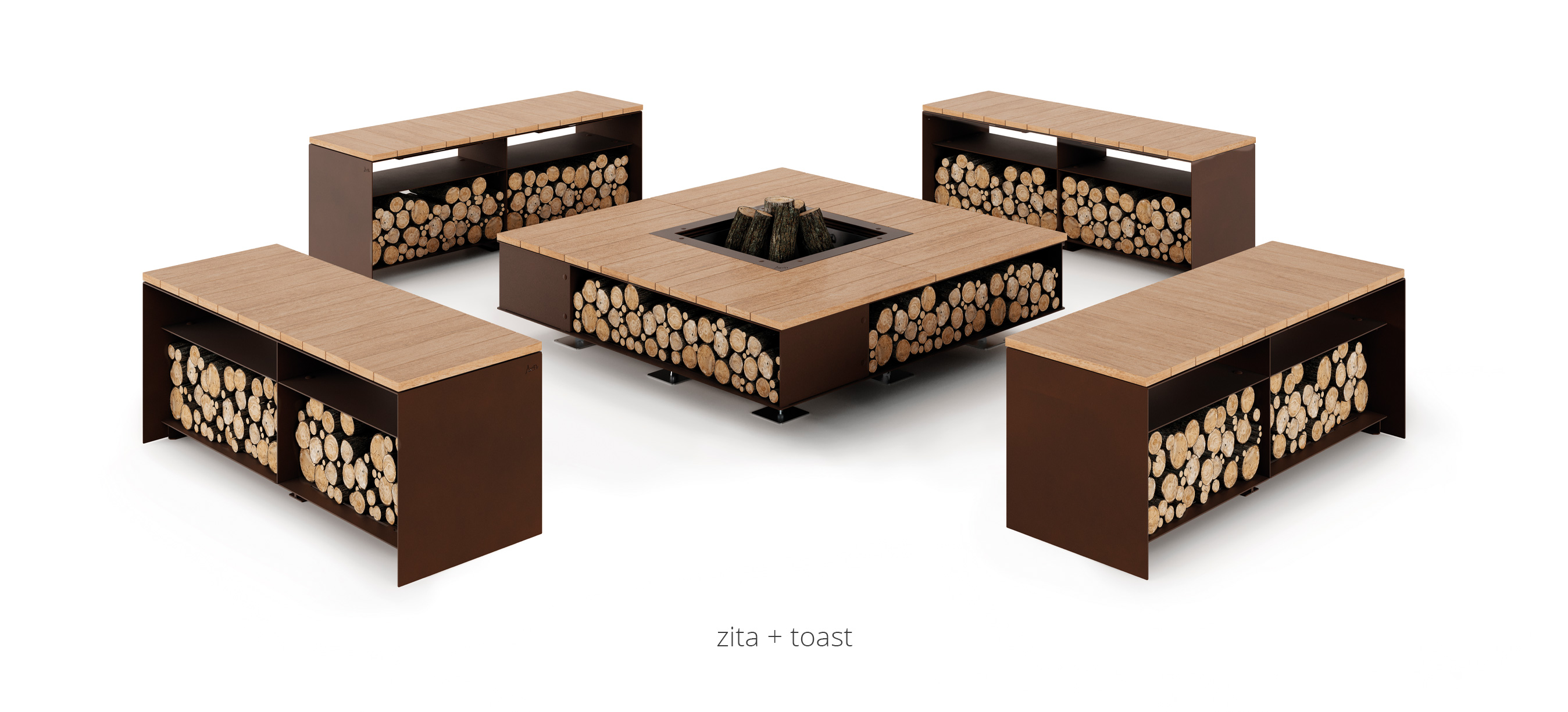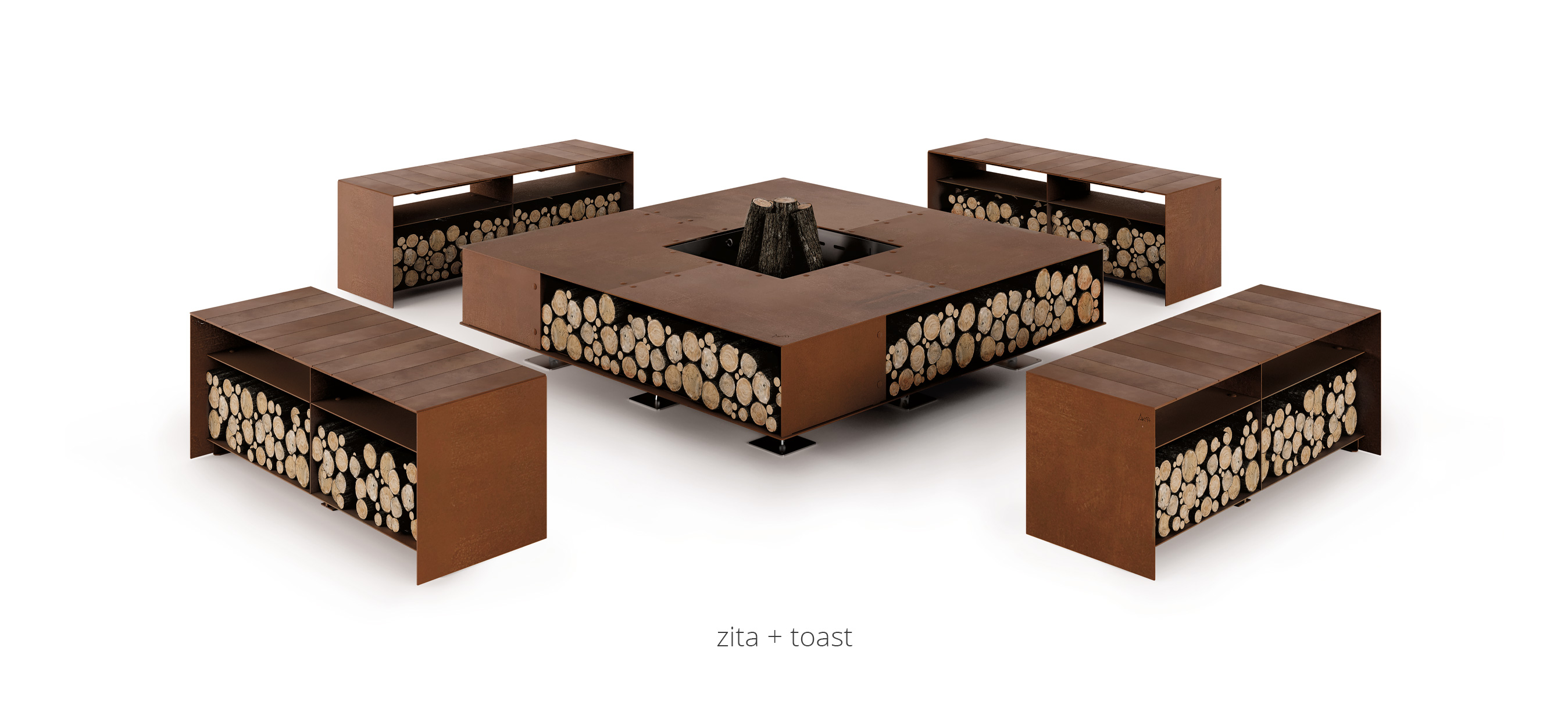 Una seduta per esterno, un nido dove rifugiarsi, lasciarsi riscaldare dal fuoco: all'eccentrica danza delle fiamme si sostituisce il silenzioso ardere della brace.